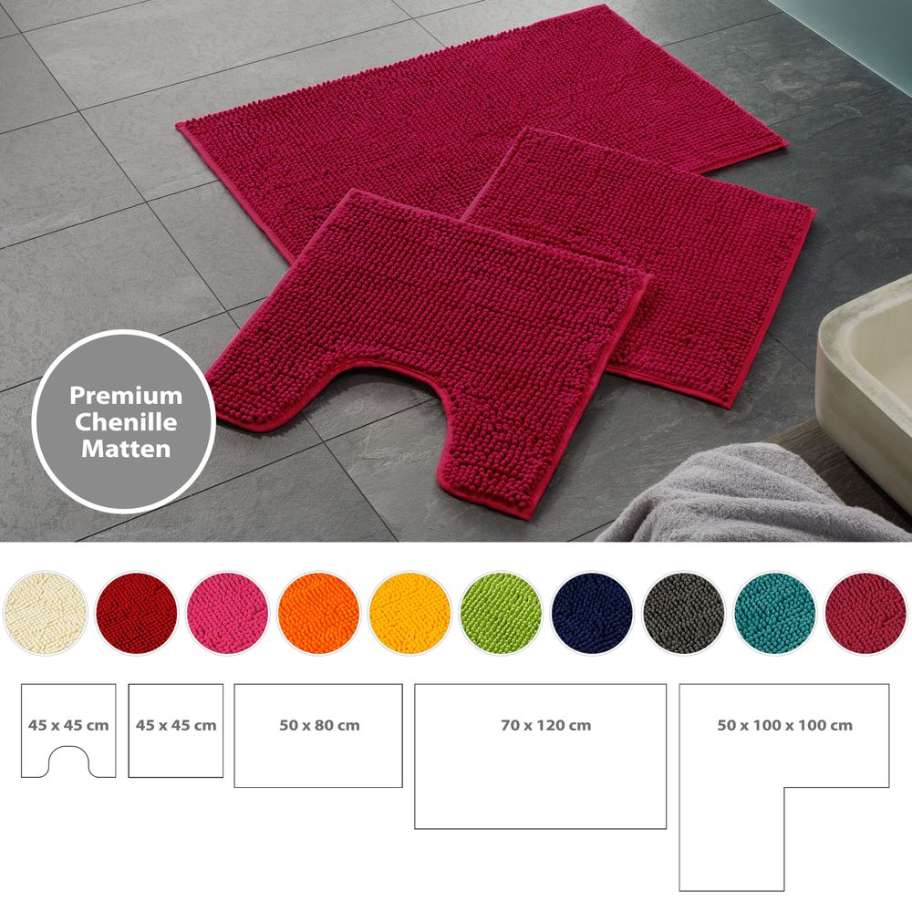 Variiere die Microfaser Chenille–Badematten Serie nach Deinem Wunsch. Ob nun als 3er Set für das große Badezimmer oder als einzelne Matte im Gäste WC. Durch unsere große Auswahl an leuchtenden Farben sind Deinen Ideen keine Grenzen gesetzt. Unsere kuschelige und ebenso saugkräftige wie schnelltrocknende Matten Serie überzeugt durch hochwertige Qualität.